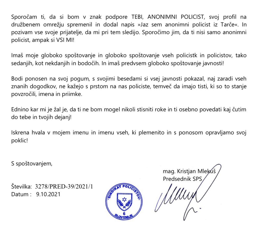 PISMO ANONIMNEMU POLICISTU. Ti si glas vseh nas 09102021. Ti si glas vseh nas.